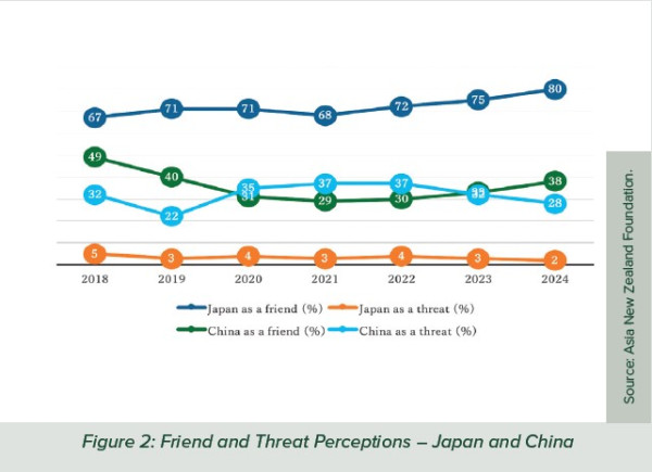When asked about trust, 62% of respondents expressed a high level of trust in Japan, compared with only 4% expressing low trust. For China, the pattern is reversed: 14% expressed high trust, while 48% expressed low trust (with 34% neutral). Figure 2 below illustrates these trends in New Zealanders’ friend/threat perceptions of Japan and China over the last seven years.